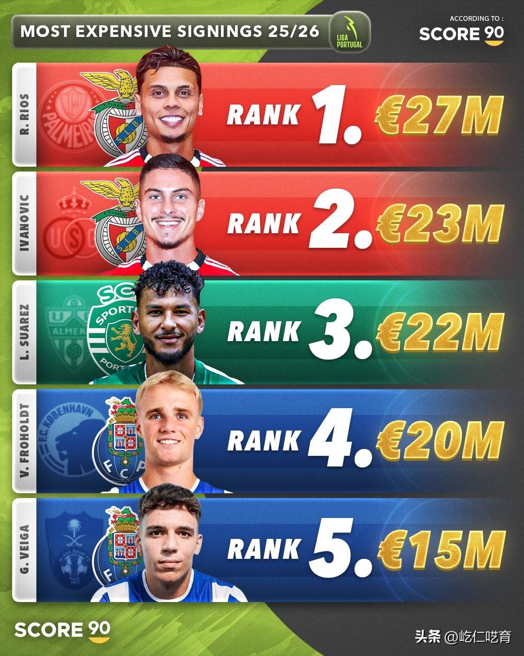 SCORE 90发布2025年夏窗,五大联赛 葡超的转会费前五名的引援排名
