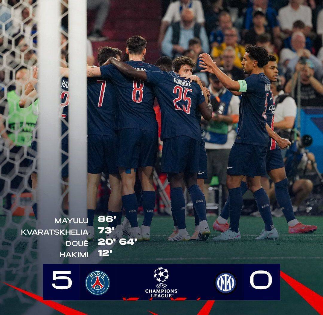 落后的国米试图通过换人调整打开局面,但依然机会寥寥。反而大巴黎屡屡通过快速转换制造杀机,杜埃、克瓦拉茨赫利亚和马尤鲁先后进球,将最终比分锁定在5:0。